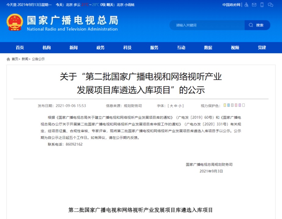 查看詳情?國家廣播電視總局規(guī)劃財務司發(fā)布《關(guān)于“第二批國家廣播電視和網(wǎng)絡視聽產(chǎn)業(yè)發(fā)展項目庫遴選入庫項目”的公示》